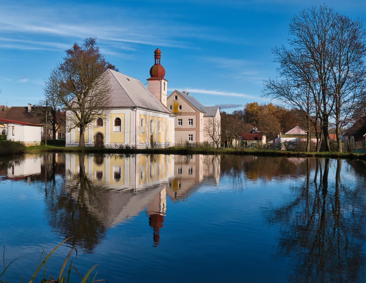 Auf dem Weg nach Marienbad entdeckte ich kurz nach dem Grenzübergang bei Mähren an der Landstraße 201 diese Kirche, die sich perfekt in dem kleinen Weiher spiegelte.